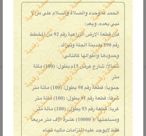 🟨 المساحة 10,000 م 🟡 الواجهةشمالية 🟡 الأطوال100*100 🟡 السعر 125,000 ريال رقم القطعة 92 ملاحظة: السعر غير شامل الضريبة والسعي المشاهدات 5