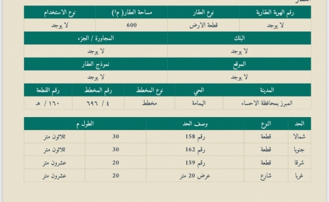 🟡 رقم الأرض 160 🟨 المساحة 600 م 🟡 شارع عرض20 🟡 الواجهةغربية 🟡 الأطوال30*20 🟡 المتر 1,300 ريال ملاحظة: السعر غير شامل السعى والضريبة المشاهدات 23