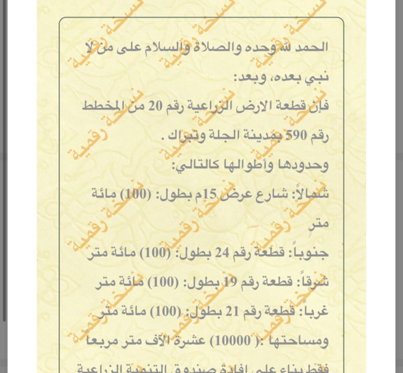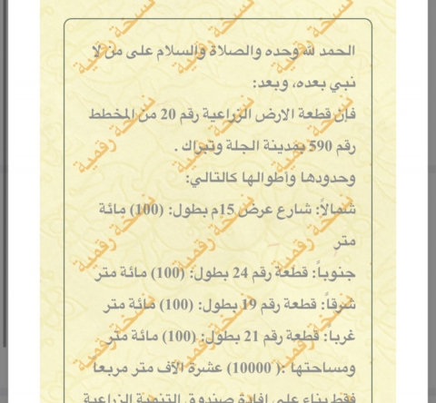 🟡 رقم الأرض 20 🟨 المساحة 10,000 م 🟡 شارع عرض100 🟡 الواجهةشمالية 🟡 الأطوال100*100 🟡 السعر 125,000 ريال رقم القطعة 20 ملاحظة: السعر غير شامل الضريبة والسعي المشاهدات 8